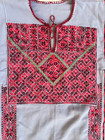 The off-white and red colors combined with the handmade embroidery style showcase the art deco look of the 1970s. Made from cotton and polyester, this original dress from the West Bank is perfect for all occasions, Real Handmade stitched in the Ramallah West Bank Palestine, fitting a Large to XL size.
