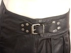 This is a Mr. S black leather kilt. The kilt is in very good pre-owned condition with no holes or tears or stains. Waist: 15" (smallest) to 15.75" (largest). Total Length: 12.75".