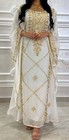 This product is a Middle Eastern gown dress in a white and gold color scheme, designed in size X- small and runs larger. Perfect for those looking for traditional Middle Eastern attire with a touch of elegance and sophistication. Item was only worn once for a few hours!