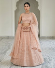 Thisbeautiful blush pink embroidered lehenga choli set, perfect for weddings, receptions, and festive occasions. Style: Sleeveless Choli with Flared Lehenga. Color: Soft Blush Pink. Work: Intricate Embroidery with Sequins & Thread Work.