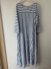 We are a group of clothing enthusiasts based in Kyoto. We look forward to sharing exciting, heartwarming fashion with fellow fashion lovers around the globe! A long, three-quarter sleeve dress made from refreshing blue striped jersey fabric.