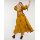 Free People Midi Dress Let's Be Friends Puff Sleeve Tiered Mustard Yellow M Boho