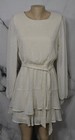 Eggshell patterned stripe dress with matching belt, tiered skirt. Long sheer sleeves with elastic cuffs. Buttons at back of neck, belt ties at waist. Machine wash cold gentle, line dry. Materials - 99% Polyester, 1% Lurex with 100% Polyester liner.