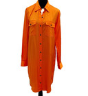 Material: 100% Viscose (soft, flowing fabric). Details: Full button-front closure, classic collar, two button-flap chest pockets, long sleeves with 2-button cuffs. Style: Shirt Dress / Tunic. Color: Bright Orange.