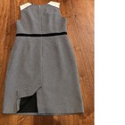 Sleeveless sheath dress features a sophisticated geometric micro-print in black and white, accented by a solid white sweetheart-illusion neckline and a black defined waistline. This polished silhouette offers a structured fit with a back zipper closure and a subtle back vent for ease of movement. Fully lined for a smooth drape, it transitions effortlessly from professional office settings to evening events. Brand: Nine West Size: 10 Color: Black, White Pattern: Geometric Micro-Print Neckline: Round with Sweetheart Contrast Sleeve Length: Sleeveless Closure: Back Zipper Length: Knee Length Style: Sheath Material: Textured Fabric Lining: Fully Lined Occasion: Business, Cocktail, Workwear Features: Waist Definition, Back Vent