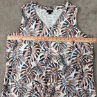 J. Jill Wearever Collection sleeveless shift dress in a vibrant tropical monstera leaf print. Crafted from a soft, wrinkle-resistant rayon and Lycra spandex blend, this travel-friendly piece features a flattering V-neckline and convenient side seam pockets. The multi-color botanical pattern includes shades of pink, blue, and brown on a white ground, making it a versatile choice for vacations or casual summer outings. Measurements: • Pit to Pit: 22" • Waist: 23" • Length: 38"