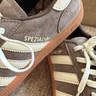 Adidas Handball Spezial Addis Size 7 US Earth Strata / Off White / Gum (brown) suede gum sole sneakers. Retro Adidas Originals look – Handball Spezial is similar vibe to Samba 7 Gazelle. Designed in the iconic Spezial silhouette, they’re perfect for fans of retro Adidas, casual terrace trainers, and indoor soccer–inspired sneakers.