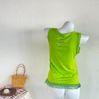 Neon green tank top featuring a bold cross and rose print with glitter accents. Designed with delicate lace trim along the neckline and hem, this piece blends edgy Y2K and grunge aesthetics with a feminine touch, perfect for festival wear, streetwear, or statement outfits. US S/M: Length approx. 23", Bust approx. 32". Made from soft, stretchy fabric for a comfortable fit, suitable for everyday styling or standout event looks. Color may vary slightly due to lighting and screen settings.