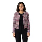 IRO Paris multi-color bouclé tweed jacket features a vibrant blend of purple, pink, and neutral tones in a textured weave. The interior is partially lined for comfort, while the exterior showcases intricate fringe-like detailing characteristic of high-quality tweed.