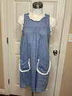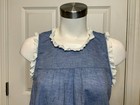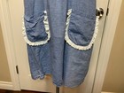 Lotte Dress. Lightweight, blue chambray body. White eyelet ruffle trim at neck, arms and pockets. Pullover with button at keyhole opening at back of neck. Length: 34".