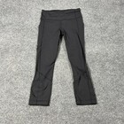 Brand: Lululemon Item: Cropped athletic leggings/pants Gender: Womens Size: 4 (size dot present inside back pocket) Color: Black Features: High-rise waistband with internal drawcord Features: Back zip pocket at waistband for essentials Features: Paneled legs with flatlock seams for comfort and movement Features: Reflective Lululemon logo at lower leg Use: Ideal for yoga, running, training, and everyday athletic wear Notes: Please review photos for fit and details; measurements are shown for reference in the images.