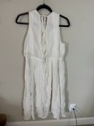 Mystree ivory boho dress in a lightweight gauze fabric. • Size Medium • Deep V neckline • Sleeveless design • Adjustable drawstring waist • Lace trim and embroidered details • Lightweight, flowy silhouette Fabric features an intentional crinkle texture (not wrinkled from wear). Condition: Great pre-owned condition. Perfect for summer, beach, vacation, or festival outfits.