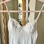 Estimating an XS. Can’t make out the size or brand. It is 100% polyester and made in Brazil. So gorgeous, it does have some small marks in places as shown (bra, bottom of dress, back clasp). Maybe it can be bleached or even dyed. One flower at the bottom of back of dress is missing. Floral Crochet details and little flowers going down the back side. This reminds me of a bridal lingerie night gown slip or even just a vintage photography session dress! So many possibilities with this one. Tags: crochet, vintage, embroidered, flowers, bridal, wedding, fairy, fairy core, fairycore, boho, cottage core, cottagecore, dreamy