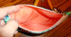 Small Ipsy Glam Bag. Cute accessory for travel or storage at home to organize Makeup and brushes. Measures hieght 5 inches and width 7 inches. Exterior with palm branches in green and teal with a background of pink. Interior is peach in color.