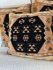 Boho feel. Set of three matching throw pillows. In like-new condition. Warm, inviting colors with a solid black back. The front is soft, velvet-like and the back is probably a blend of poly and cotton.