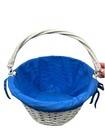 White Wicker Basket, Single Handle, Metal Hinges, Blue Fabric Liner. {90}.
