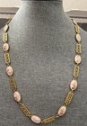 NECKLACE Rectangular Gold Metal Flowered Links w/Oval Painted White/Rust Enamel Links In Between, 28 inches. Pretty! Gold is lightly faded in places, but otherwise in good Pre Owned condition. See Photos (4500)