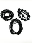 3 – Pebble & Faceted Alternating Bead Necklace. 1 – Chunky Faceted Black Acrylic Necklace. 2 – Multi-Strand Black Seed Bead Necklace (approx. 15 strands). Materials: acrylic seed beads. All three pieces are lightweight acrylic constructions, making them comfortable to wear despite their visual impact.