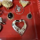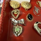 Gold plated heart brooch, ribbon & heart with rhinestone, earrings heart & pearls, heart pin, 2 vtg pendants, coin & gold choker pendant.