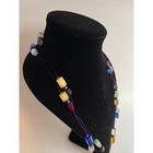Vibrant long strand necklace features a whimsical array of multi-colored Murano glass beads in rectangular and round shapes. Strung on a delicate purple cord, the translucent and opaque beads include shades of cobalt blue, emerald green, amber, and amethyst. This versatile piece can be worn as a single long layer or doubled for a stacked look, making it a perfect statement accessory for adding a pop of color to any outfit.