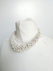 Multiple strands of white seed beads. Layered, draped design for fuller look. Faux pearl accents near clasp.