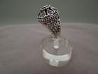 Gorgeous princess harem ring with pinnacle structure and garnet in center surrounded by teardrop multi gemstones. Oxidized filigree design on either shank.