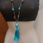 Hippie Bohemian Faux Turquoise Frosted Glass Beaded Braid Tasseled Necklace