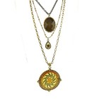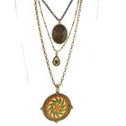 J. Jill multi-strand necklace with pendants in triple chains, 18" to 21" along the shortest strand, 5" drop, 24 to 27" along the longest strand, gold and black color, floral and lace pattern, very good condition, lovely necklace.