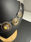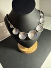 Statement necklace featuring multiple faceted blue disc accents with rhinestone-style borders on a silver tone chain. Pre-owned with light wear consistent with age. Please review all photos carefully, as they are part of the item description and show the exact condition of the item you will receive.