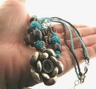 Rose pendant double strand beaded necklace in gray fresh water pearl, faceted smokey quartz crystal, turquoise enamel and glass beads, 16 to 17" wearable length, 2" drop, very good condition.