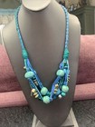 Boho Signed LONNIE LOVNESS Hand Crafted Blue Aqua Beaded Leather Necklace 24”