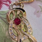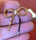 Very nice may have been used condition in the original box! Gold tone brooch is shaped like a neatly tied bow with faux gem in the middles & rhinestone accents on the ends. The pin clasp works nicely.
