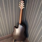Inlay: Bowtie. The 5th string tuner has been replaced. There are spikes on the 7th, 10th, and 12th frets of the 5th string. There is a repaired crack on the lower part of the resonator side, but it has been properly repaired and is not a problem.