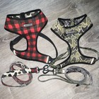 The FRENCHIE size XL Adjustable Soft Dog Harness & Leash set (2 sets) in red plaid/cow and green/gray camouflage offers comfort and style for your furry friend. Made from breathable mesh material, this unisex harness is designed to be adjustable for a perfect fit. The harness is gentle on your dog's skin while providing the security needed for walks or outdoor adventures. Perfect for keeping your pet safe and comfortable during any activities. These are used, good condition.
