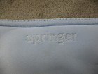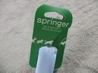 Brand: springer Style: Walk Bag with Regular Leash in a light blue color; dog walking crossbody/waist pack. Visible markings: "springer" embroidered on pouch and on hang tags; strap shows "CARLISLE" print as pictured. Details: Zippered main pocket, front mesh sleeve pocket, waste-bag dispenser slot, adjustable strap, multiple D-rings, and swivel snap hooks; metal hardware throughout. Includes the matching regular leash attached to the bag. Packaging: springer green header card and round hang tag included.