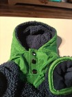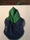 The Frisco Dog Jacket in navy blue and Kelly green fleece is a warm and stylish option for small puppies. Made from cozy polyester material, this hoodie features a hood and is designed specifically for winter apparel. It is a cute and practical choice for keeping your furry friend comfortable and snug in cold weather. In good shape. No tears or stains.