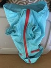 Cute little blue dog rain jacket. Perfect for outdoor adventures. I try to use recycled, (but clean!).