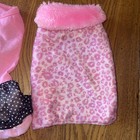 Sweet little sweater. Ruffle hem, turtle neck, knit lace trimmings. Lined Vest, jacket, Quick on/off. Pink Princess tank top with ruffle bottom. 'Princess' Rhinestone. Three pieces of pet clothing.
