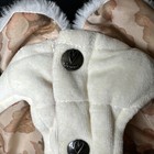 High quality fabric and cozy hood on a Size Large navy blue dog coat. Elastic at arms and belly plus zipper closure make for a great fit. Blue camo lining makes coat lightweight - and reversible! Machine wash and line dry.