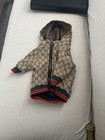 The Henri Bendel lined dog raincoat is designed for small-sized terrier dogs, featuring a stylish brown and white striped exterior and brown fleece lining. This coat/jacket is perfect for keeping your furry friend warm and dry during rainy days, with the added convenience of a pocket for storing small items. The high-quality Henri Bendel brand ensures durability and style for your beloved pet. The body of the coat (not including the hood) measures 12" in length. This item is in like-new condition.