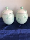 2 Ceramic Pet Treat Jars W/Lids-9” H X 4.5” W-Mint Green Paw Prints W/White Base. **Here for sale are 2 fun ceramic pet treat jars in excellent condition. No cracks or chips. Contemporary art. I have selected the parcel ground shipping option which can take 2-9 days for delivery and no insurance. Please see pics for personal judgment**