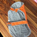 Bright orange quilted puffer dog coat with a cozy grey terry lining. This stylish outerwear features a functional hood and an adjustable strap for a secure and comfortable fit. The quilted design provides warmth, while the soft lining ensures comfort for your furry friend. Perfect for walks on chilly days or keeping your pet dry after a bath. Measurements: • Length (collar to hem): 16 in • Chest (side to side at widest point): 18 in • Neck opening (across): 6 in Type: Winter Jacket Material: Polyester Features: Warm Keywords: dog coat, puffer jacket, pet outerwear, hooded dog coat, adjustable strap, warm dog clothing, winter dog coat, dog apparel, quilted dog jacket, terry lined dog coat, bright orange dog coat, dog winter wear