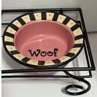 PetRageous Designs hand-painted stoneware dog bowl set features a whimsical pink and black color palette with "Woof" script inside each basin. The two ceramic bowls are adorned with bold polka dots on the exterior and a striped rim accented by pink dots, all resting securely in a sturdy black wrought iron scrollwork stand.