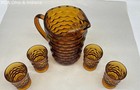 Pressed Glass Amber Cube Pattern Pitcher and Juice Glass Set Vintage 5 Pieces