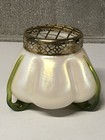 CIRCA 1900 LARGE ART NOUVEAU LOETZ KRALIK ART GLASS FOOTED FLOWER FROG IN PEARLESCENT WHITE WITH IRIDESCENSE GLASS WITH BRASS FLOWER FRONG SCREEN. IT IS NOT PERFECT WITH A FEW TINY FLAKES BUT STILL A VERY NICE PIECE. MEASURES 6 3/8" HIGH X 7" WIDE. WILL BE DOUBLE BOXED. SEE ALL PICS