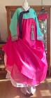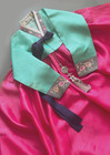 Premium Natural-Dyed Silk Hanbok Set — Embroidered Mint Jacket & Hot Pink Skirt | Includes Matching Handbag & Petticoat. Hanbok is made from non-stretch fabrics, so the top should not fit too tightly.