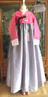 Hanbok is made from non-stretch fabrics, so the top should not fit too tightly. This elegant hanbok set features a lively pink top harmoniously paired with a gray( with Lilac Hue) skirt, creating a sophisticated and refined look.