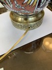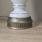 This Vintage Hand Painted Floral Glass Table Lamp features Brass base, intricate gold accents with shades of white, pink, and green, adding a touch of elegance to any indoor space. The lamp is crafted from glass and metal with a glossy finish, giving it a traditional and stylish look. The floral pattern and hand-painted design give it a unique and charming appeal, perfect for those who appreciate vintage decor. With a corded electric power source and knob control, this unmarked table lamp is a beautiful and functional addition to any home. 25" tall Lamp Socket replaced. Works like new with extra long cord.
