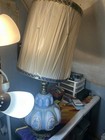 This lamp has had minor repair to a chip on the backside in- line with the cord. See photo. Lamp base is 8” Dia Base of socket is @17” With harp the lamp is @ 26” tall Lampshade is 10” x 10” Note shipping discount available, to be paid in the form of a refund