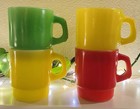 4 VTG Anchor Hocking Glass D Handle Coffee Mugs Red Green Yellow Stackable USA